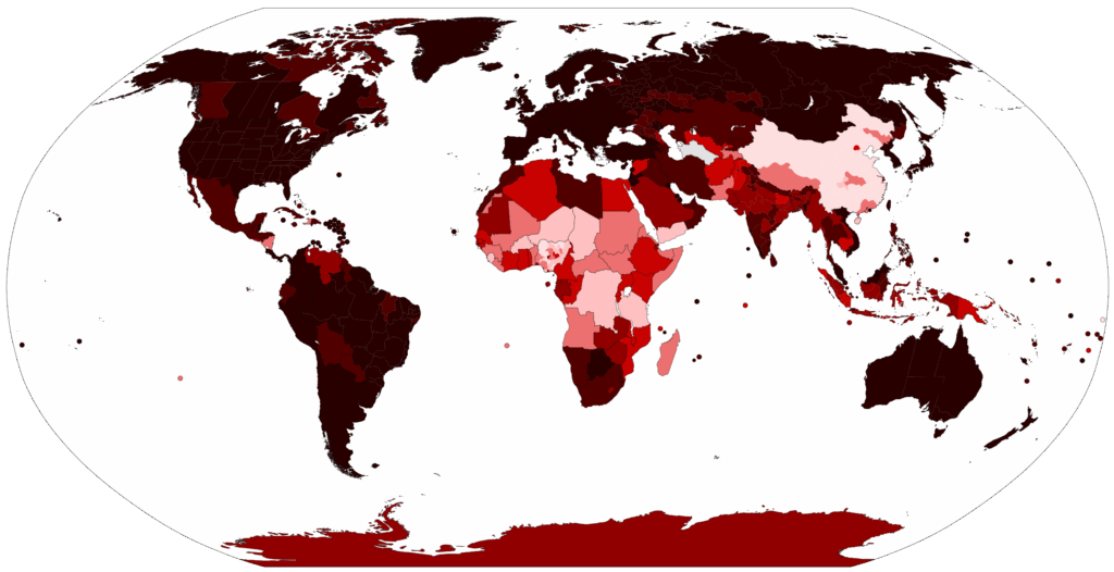 Covid Ausbreitungsgrafik: Von Raphaël Dunant, Gajmar (maintainer),幺于 (maintainer) – https://commons.wikimedia.org/w/index.php?curid=88208245 – je dunkler die Farbe, desto höher die Ausbreitung von Covid-19. Originalzahlen einzusehen unter https://de.wikipedia.org/wiki/COVID-19-Pandemie